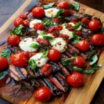 Balsamic Grilled Flank Steak Caprese is a vibrant and delicious dish that effortlessly combines the savory richness of marinated flank steak with the fresh flavors of mozzarella, ripe tomatoes, and aromatic basil. Ideal for summer barbecues or cozy weeknight dinners, this recipe not only looks stunning but also delivers robust flavors that will impress your guests. The flank steak is marinated in balsamic vinegar and grilled to juicy perfection before being layered with creamy mozzarella and fresh tomatoes. Finished with a drizzle of balsamic reduction, this dish elevates your dining experience while showcasing seasonal ingredients at their best. Dive into this easy yet impressive recipe that promises to become a new favorite!