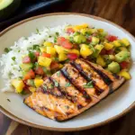 Grilled Lime Salmon with Avocado-Mango Salsa and Coconut Rice